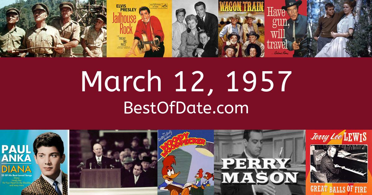 March 12, 1957, was a Tuesday. It was 68 years, 8 months, and 27 days ago. The zodiac star sign for this date is Pisces.