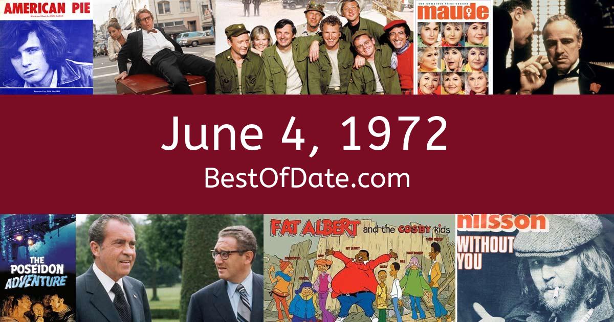 June 4, 1972, was a Sunday. It was 53 years, 6 months, and 4 days ago. The zodiac star sign for this date is Gemini.