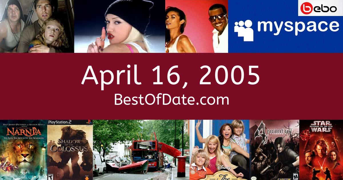 April 16, 2005, was a Saturday. It was 20 years, 7 months, and 22 days ago. The zodiac star sign for this date is Aries.