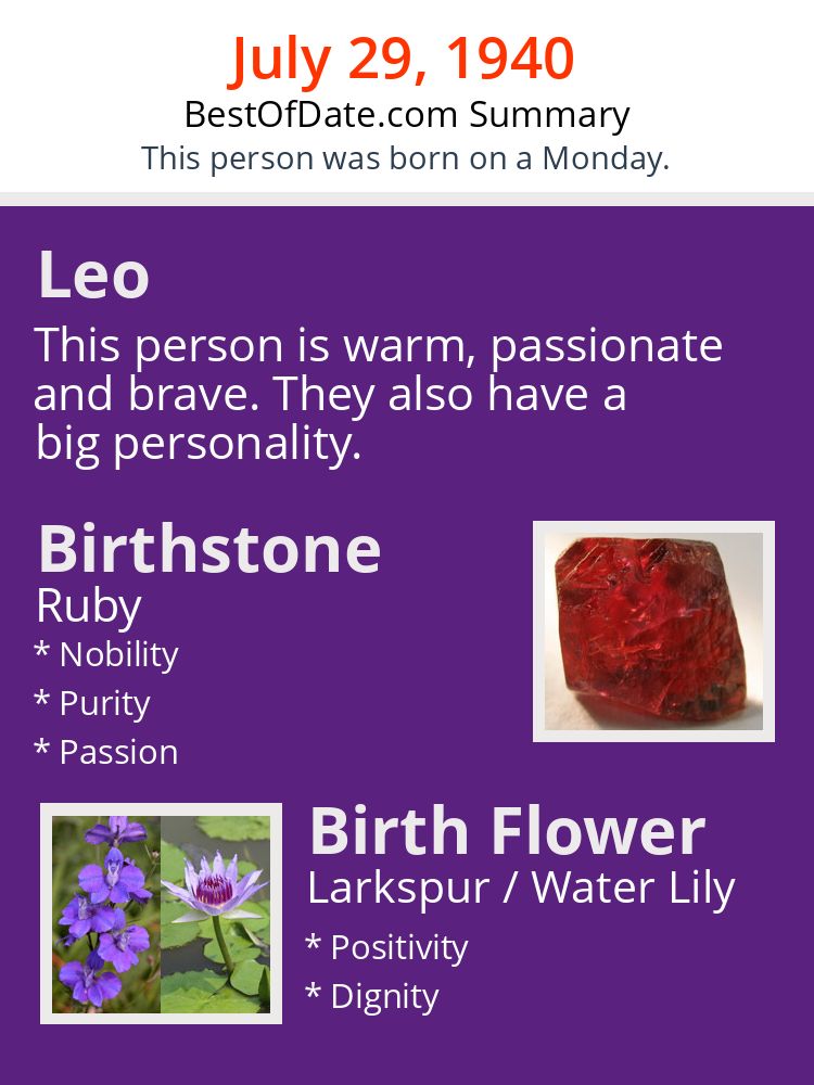 A personality summary image for people who were born on Monday, July 29th, 1940.