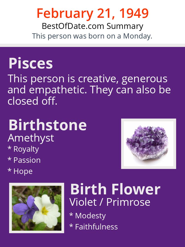 A personality summary image for people who were born on Monday, February 21st, 1949.
