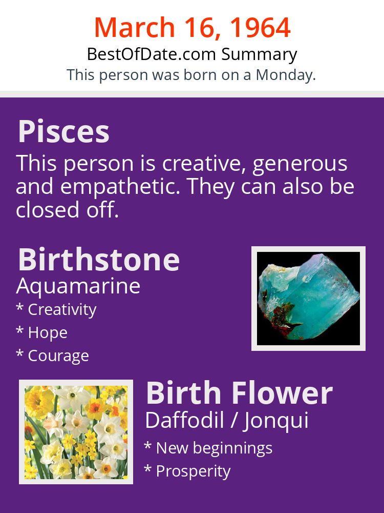 A personality summary image for people who were born on Monday, March 16th, 1964.