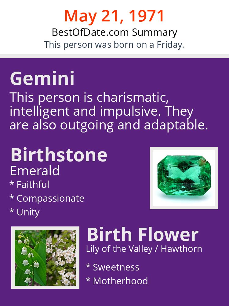A personality summary image for people who were born on Friday, May 21st, 1971.