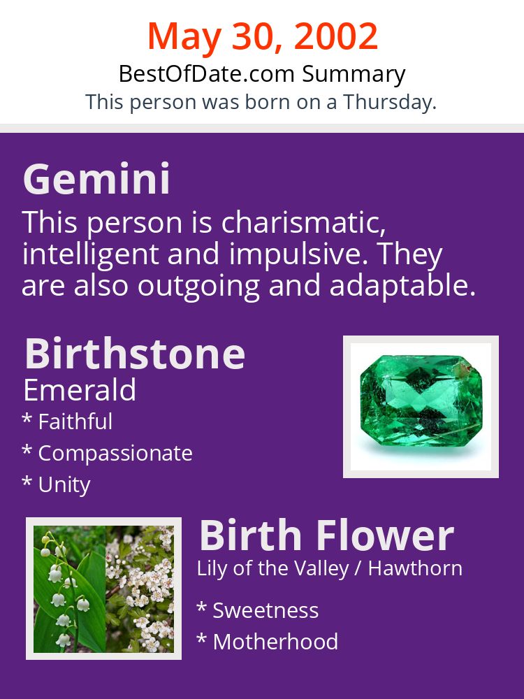 A personality summary image for people who were born on Thursday, May 30th, 2002.