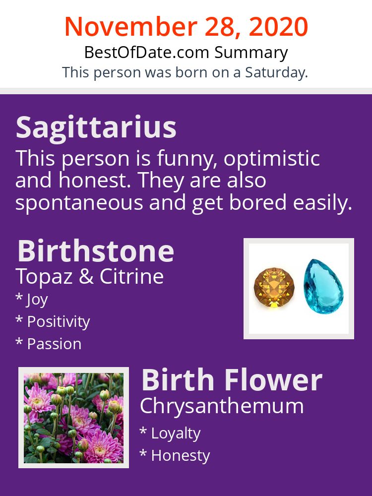 A personality summary image for people who were born on Saturday, November 28th, 2020.
