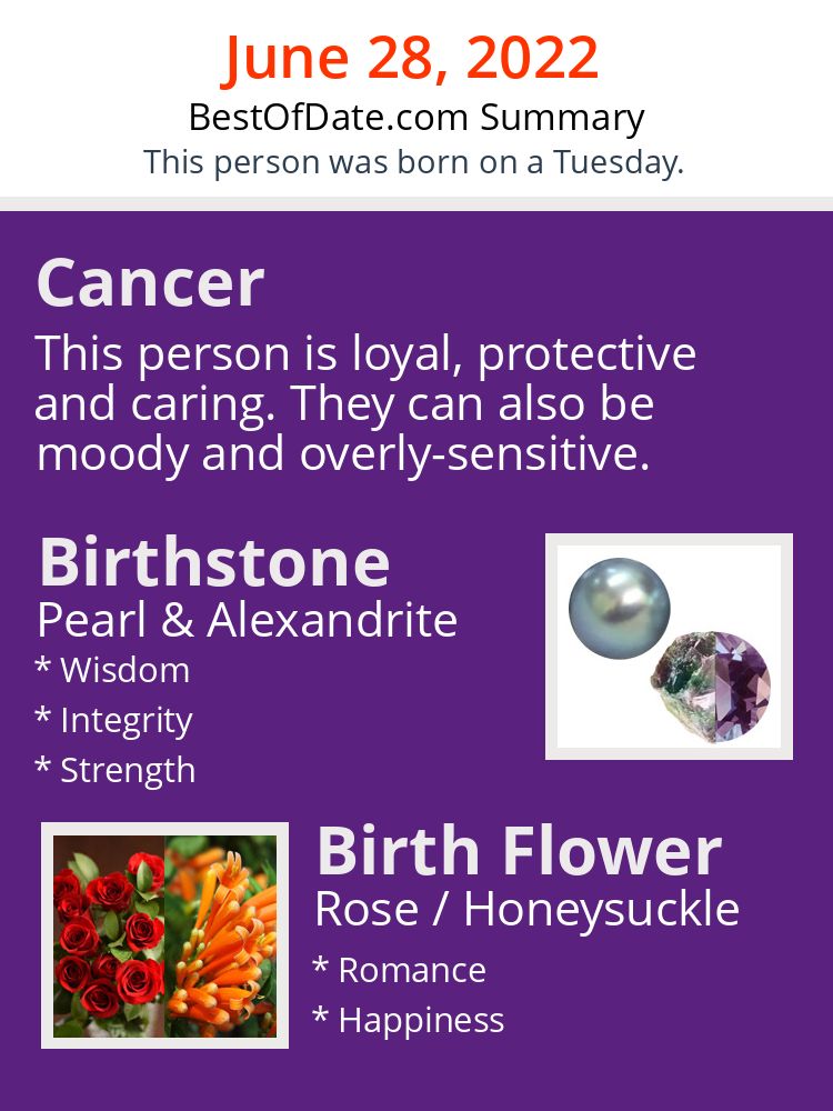 A personality summary image for people who were born on Tuesday, June 28th, 2022.